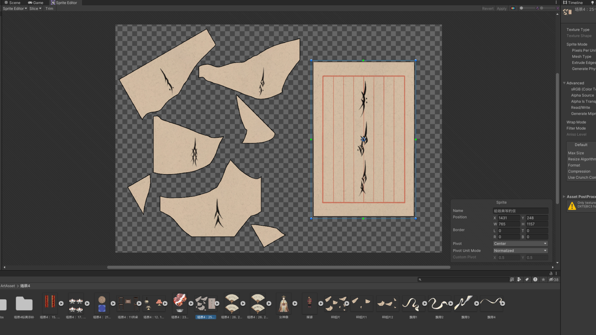 成员首先将平面素材导入Unity进行sprite切分,根据需求拼接子物品或者进一步制作绑骨动画。