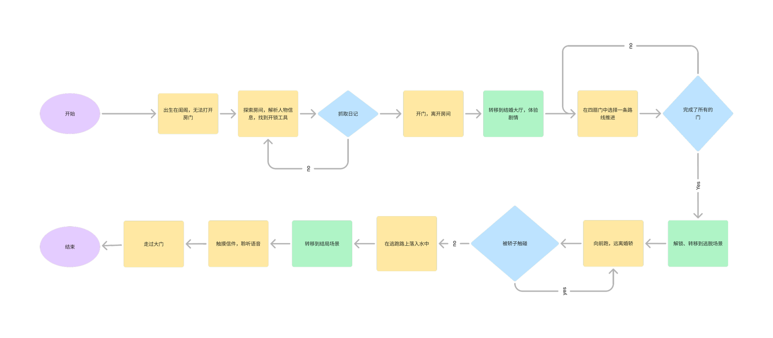 为了挑战传统VR影片的线性叙事,我们参考了游戏的“多结局”结构和沉浸式戏剧的演绎风格,设计了一条非线性故事线,给予玩家对于故事情节的“决策权”。