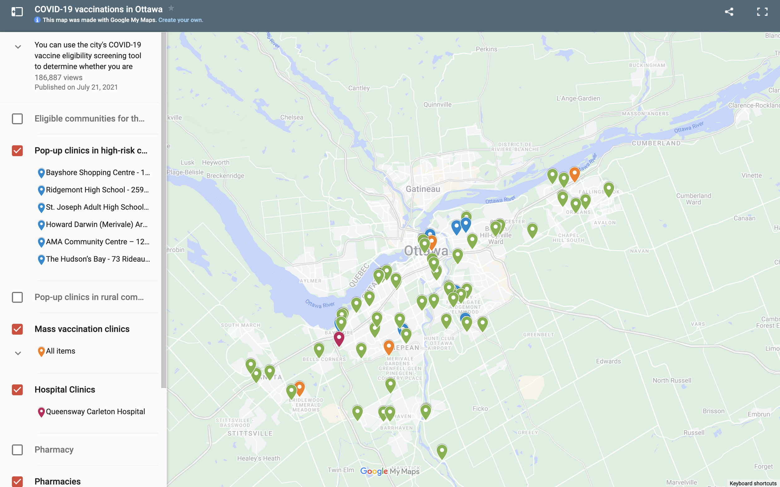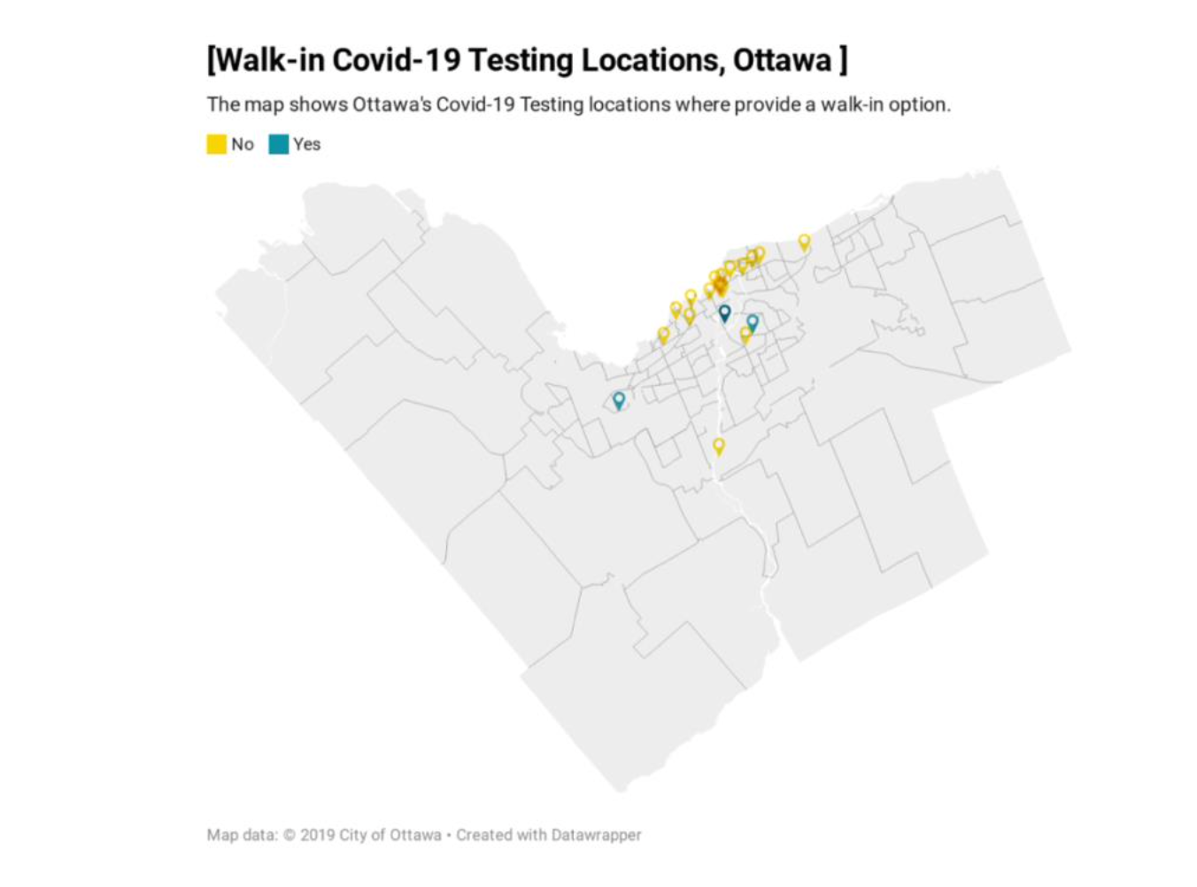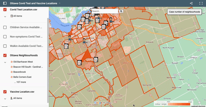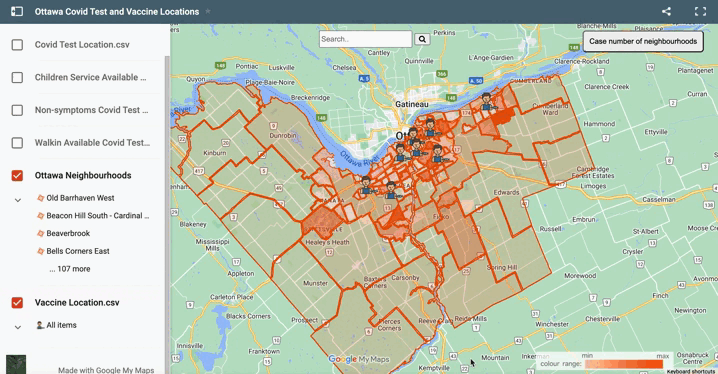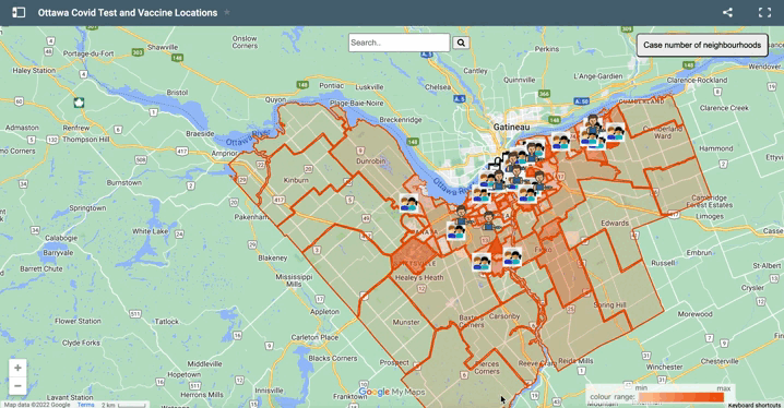 Our group planned to create an interactive map with Google My Map and Tableau to quickly inform users of up-to-date Covid cases in Ottawa neighbourhoods and locate clinics where Covid tests and vaccines were available.