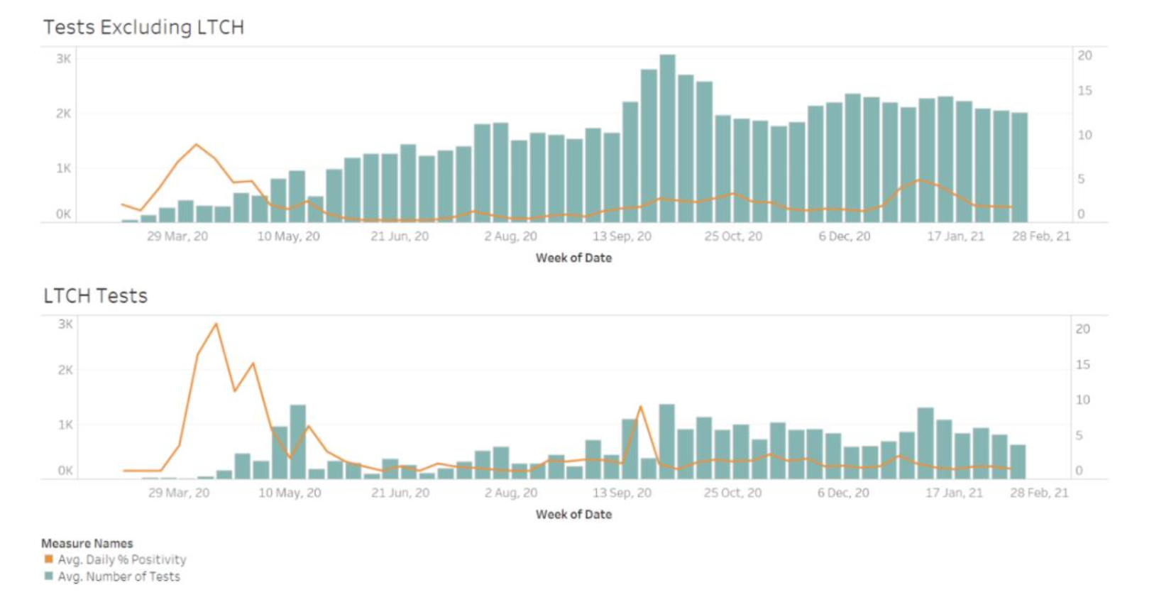 This visualization combines a line graph and a bar chart to represent the weekly number of Ottawa residents tested for COVID-19 and the percentage of residents tested with laboratory-confirmed COVID-19.