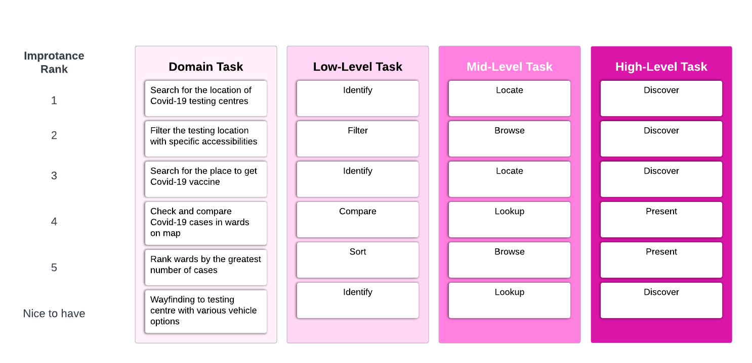 Based on our research and user interviews, we listed all the tasks we needed to accomplish with an importance ranking.